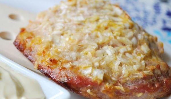 Pregatim un bol in care punem uleiul. Adaugam 2 lingurite cu mustar si amestecam pana la omogenizare. Condimentam cotletele de porc cu sare si piper, pe ambele parti. Ungem carnea de porc cu amestecul de ulei si mustar, tot pe ambele parti. Presaram deasupra fiecarei bucati de carne amestecul de ceapa si usturoi, de data aceasta pe o singura parte. Apasam usor, astfel incat sa se formeze un fel de crusta. Pregatim o tava pentru cuptor in care aranjam cotletele de porc. Introducem tava in cuptorul incalzit la 230 de grade pentru aproximativ 35-40 de minute. Pregatim sosul – punem cele 2 lingurite cu mustar ramase peste smantana fermentata. Condimentam cu praf de curry sau boia de ardei si sare. Amestecam bine, pana cand obtinem un sos fin si omogen. Cand cotletele de porc sunt rumenite la baza, iar ceapa usor caramelizata, scoatem tava cu friptura din cuptor. Servim cotletele calde, cu sosul de smantana si mustar.