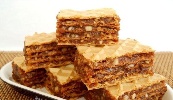 Mod de Preparare: Ouale se amesteca bine cu faina apoi cu laptele. Zaharul se caramelizeaza intr-o cratita, cand s-a topit de tot am adaugat margarina, apoi nucile, apoi amestecul de lapte. Se tine pe foc mic si se amesteca continuu, pana se mai ingroasa. Dupa ce se ia de pe foc se adauga esenta de vanilie. Se aseaza crema fierbinte intre foile de napolitana, niveland bine crema si presand putin foile de napolitana (eu am folosit 6 foi) Peste prajitura se aseaza un tocator, pentru ca sa stea putin presata, si se tine in frigider cateva ore bune.