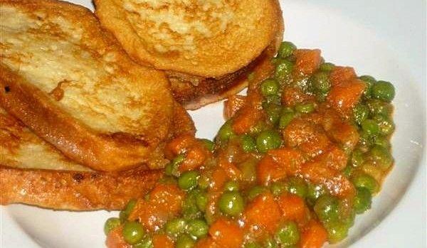 Daca nu aveti la indemana mazare congelata puteti folosi mazare de la conserva, dar in cazul acesta timpul de fierbere se injumatateste. Intr-o farfurie adanca se bate oul ca pentru omleta, se adauga putina sare si se amesteca cu 2 linguri de lapte. Feliile de paine se trec prin ou si se prajesc pe ambele parti in uleiul incins. Dupa ce se scot din tigaie se presara cu zahar. Se servesc calde.