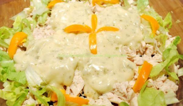 Mod de Preparare: Telina se da pe razatoarea mare. Se pune in bol. Apoi, de jur imprejur se pune un gulerash de salata taiata. Peste telina se aseaza un strat de castraveti murati taiati cubulete micute, apoi se adauga puiul taiat si el bucatele se face iar un guleras de salata verde. Deasupra se pun 3-4 linguri de sos, se decoreaza cu ardei gras colorat, chiar si gogosar rosu murat. Puteti pune un strop de ulei de masline.