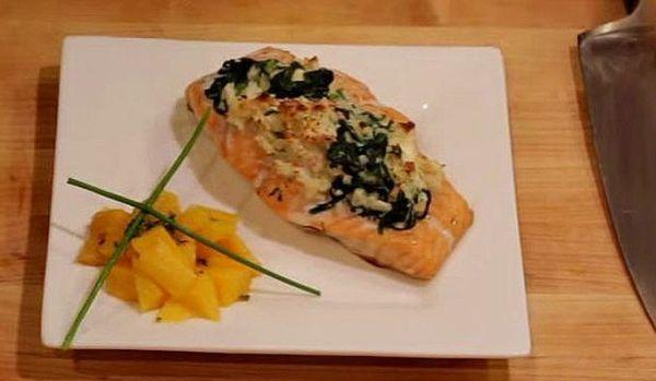 Mod de preparare: Preîncălzește cuptorul la treaptă mare și unge cu unt/ulei o tavă care nu lipește. Toacă roșiile uscate și călește-le în uleiul de măsline timp de 1 minut, amestecând ocazional. Dacă ai spanac normal, toacă-l (nu mărunt) și dă-l la călit peste roșii. Dacă ai baby spinach, doar spală-l și pune-l întreg în tigaie. Pune și busuiocul tocat peste. Nu te îngrijora dacă pare că tigaia este prea plină: frunzele de spanac se vor înmuia. Amestecă ocazional timp de aproximativ 3-4 minute până când se înmoaie de tot spanacul. Dă tigaia de pe foc, adaugă brânza feta sfărâmată și amestecă ușor cu restul ingredientelor. Pune bucățile de somon pe un fund de lemn și, cu ajutorul unui cuțit bine ascuțit, crestează-le transversal, pe mijloc, fără să feliezi de tot (formezi portofelul în care să bagi umplutura). Dacă se întâmplă să tai de tot din greșeală, nu e problemă: poți să pui umplutura între cele 2 bucăți formate. Cu ajutorul unei linguri, distribuie umplutura între cele 2 bucăți de somon. Mută cu grijă apoi peștele în tava dinainte pregătită. Presară sare și piper pe deasupra. Dă la cuptor (pe rândul din mijloc, de preferat) aproximativ 25 de minute. Merge extraordinar de bine cu niște sos olandez deasupra. Se poate servi cu o salată de spanac proaspăt alături sau una de broccoli.