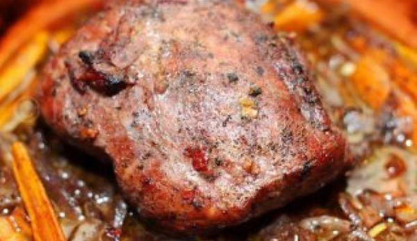 Mod de Preparare: Intr-un vas punem bucata de pulpa si cu ajurotul cutitului impanam friptura cu bucati de usturoi. Adaugam 250 ml vin si cele doua linguri cu ulei de masline. Condimentam cu sare, piper, ardei iute, foi de dafin si cimbru, acoperim vasul si il lasam la frigider pentru 2-3 ore. Intr-un vas ceramic punem morcovii si ceapa taiata si pe acest patut de legume, bucata de friptura. Turnam intreaga marinada si dam la cuptor. Din cand in cand deschidem cuptorul si verificam daca friptura mai are sos. Cu o lingura luam sos de vin si stropim friptura. Dupa aproximativ o ora, intoarceti bucata de carne si nu uitati din cand in cand sa verificati sosul si sa stropiti friptura. Sosul va scadea asa ca va trebui completat cu vin sau cu apa. Durata de preparare depinde de intensitatea fiecarui cuptor si bineinteles de grosimimea bucatii de carne. Friptura mea, la 180 de grade friptura a durat cu aproximatie doua ore. Morcovii sunt crocanti, iar ceapa are o aroma foarte interesanta. Se poate servi cu salate, muraturi sau orice fel de garnitura preferati.