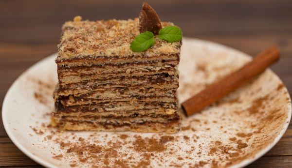 Cand sunt gata toate foile iar crema s-a racit, alterneaza foile de prajitura cu crema, iar deasupra orneaza prajitura cu ciocolata rasa sau cacao. Da prajitura cu foi si ciocolata la frigider cu o greutate deasupra (tocator de lemn) si las-o pentru minim 8 ore la rece inainte de servire.