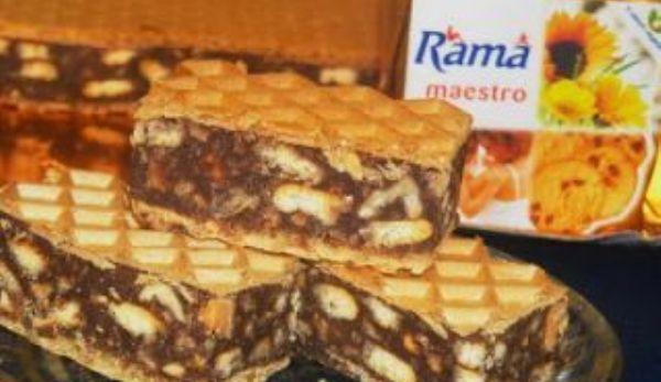 Mod de Preparare: Ciocolata rupta bucatele se pune impreuna cu jumatate din frisca pe baie de abur, se amesteca pana se topeste, apoi vine pus untul si la urma restul de frisca si vanilia. Se amesteca compozitia pana se omogenizeaza bine. Biscuitii se faramiteaza, strans cu mana si se amesteca cu alunele. Peste biscuiti se pune compozitia cu ciocolata si se amesteca. Se poate pune in orice tavita care are pereti mai inalti, pus in tava de chec; pus folie in tavita si foaie de napolitana, turnat compozitia si deasupra pus iar napolitana. Se lasa la rece pana se intareste, nu dureaza mult in maxim o ora se poate scoate din tavita si se poate taia.