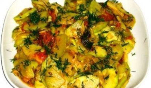 Mod de Preparare: Curatati dovlecelul de coaja si taiati-l in 4 pe lungime. Apoi taiati-l feliute cat puteti de subtiri. Despielitati rosia si taiati-o bucatele. Curatati si tocati ceapa. Pregatiti condimentele.