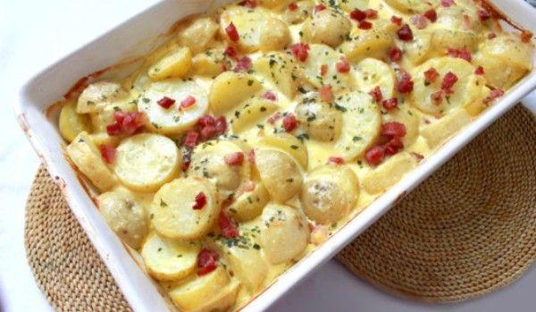 Mod de preparare: Întâi de toate, încălzește cuptorul la 200 grade Celsius și unge o tavă cu unt. Pune cartofii la fiert în apă fierbinte, cu sare, tăiați rondele sau cubuleți, în funcție de cum îți plac să-i servești. Se fierb timp de 10-15 minute, în funcție de grosime. Atenție! NU trebuie să îi lași să se facă până la capăt. În continuare, amestecă smântana cu oul și parmezanul și presară puțină sare și puțin piper. Taie ceapa și pune-o la prăjit în unt. După ce devine ușor aurie, sticloasă, adăugă curcanul tăiat cubulețe. Se lasă puțin la călit, până începe să se simte aroma cărnii de curcan. Separat, poți pune prăjit (ușor) câteva bucăți de bacon sau costiță, tăiate mărunt. La final, scurge cartofii de apă și taie-i dacă nu i-ai tăiat înainte de a-i pune la fiert. Pune cartofii în tavă, adaugă sosul cu smântână pe deasupra și presară bucățile de carne pe deasupra. Se dă la cuptor până se rumenește ușor – aprox. 30 de minute. După 15 minute, se reduce la jumătate focul și se verifică dacă cartofii s-au pătruns.
