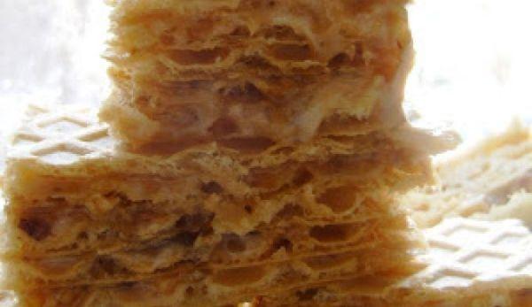 Odata format acest sos de caramel adaugi crema ta spuma din oua cu zahar si amesteci bine de tot. Adaugi nucile macinate, sunt foarte gustoase daca le-ai prajit 1-2 min inainte, in cuptor! Ai mare grija cand prajesti nucile pentru ca se fac imediat si 1 minut in plus inseamna carbonizarea lor, asa ca nu depasi 3-4 minute in cuptorul incins deja. Poti macina nucile in mixer, nu foarte marunte dar nici foarte mari. Amesteci bine de tot toata compozitia la foc mic, pana arata omogena si o pui in foi. Tapeteaza o tava in care sa incapa foile de napolitana cu ceva folie de aluminiu, aseaza foia de baza, cu grilajul in jos, astfel incat tu sa poti intinde crema pe partea fina. Adaugi cealalta foaie si tot asa, ultimul start fiind foaie de napolitana evident. Se acopera cu folie de aluminiu, se pune un tocator sau ceva mai greu peste ca sa tina foile lipite, se da la rece, prin vre-o camara, balcon ceva, si se poate taia a doua zi.