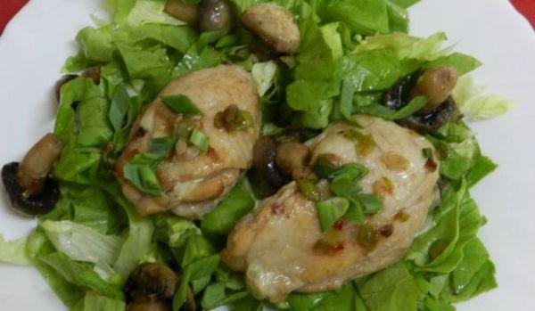 Mod de Preparare: Pulpele se spală bine și se pun la fiert pentru 15 min în oala de presiune (sau 25-30 min. în oală normală - atenție să înlăurați spuma). Se poate pune în apa care fierbe și o ceapă și un morcov. (astfel putem obține și baza unei supe de pui cu fidea sau găluște). Se scot pulpele din apă și se lasă la scurs. Se condimentează cu sare și piper. Usturoiul verde se curăță și se toacă mărunt. Ciupercile se curăță și se taie în două dacă sunt mai mari. Încingem ulei de măsline într-o tigaie și călim 2-3 minute usturoiul (păstrăm câteva frunze verzi pentru ornat). Adăugăm în tigaie și ciupercile și amestecăm bine. Lăsăm la foc mare pentru 2-3 minute, după care aducem și pulpele în tigaie. Lăsăm pulpele de pui pe foc câte 3 minute pe fiecare parte și stingem focul. Servim pe pat de salată verde stropită cu ulei de măsline și zeamă de lămâie și ornăm cu usturoi verde tocat mărunt.