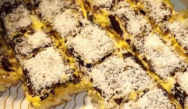 Bate albușurile cu zahărul spumă tare, adăugând pe rând câte o lingură de apă clocotită și cele două linguri de zeamă de lămâie. Bate încontinuu 2-3 minute. Apoi încorporează, încet și cu mișcări largi, nuca de cocos, făina și zahărul vanilat. Întinde aluatul rezultat uniform în tavă. Dă-l la copt la foc potrivit cam 20-25 de minute. Dacă ai cuptor electric bagă-l la 180 de grade, în jur de 45 de minute.