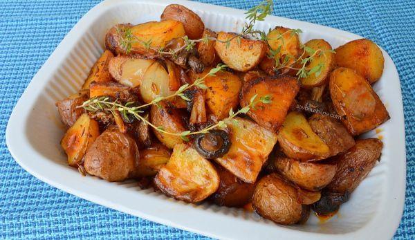 Introducem tava cu cartofi în cuptorul preîncins la 200° C (functia sus+jos+ventilație sau treapta mare la cuptoarele pe gaz) și lăsăm cartofii să se rumenească 40-45 min. Tava NU se acoperă și nici NU se pune apă în ea! Ceapa și ciupercile vor lăsa mult lichid. Cartofii sunt gata, rumeni și aromați. Am mai presărat și niște cimbru proaspăt deasupra. Ce arome faine au!