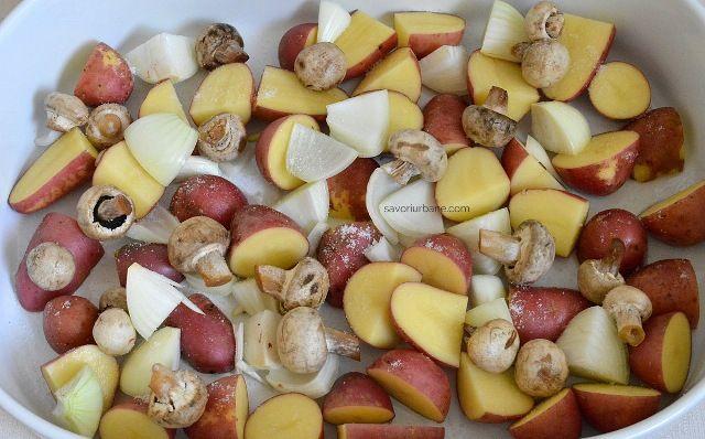Mod de preparare: Ceapa se curăță și se taie în sferturi. Ciupercile se curăță sau se spală în funcție de caz și se lasă la scurs și zvântat pe servețele absorbante sau în strecurătoare, ca să scăpăm de excesul de apă. Dacă ciupercile sunt foarte mari, le tăiem sferturi pentru că altfel riscăm să rămână crude. Eu am avut ciuperci foarte mici asa că le-am lăsat întregi. Am pregătit și sarea, cimbrul, chimenul și boiaua dulce (paprika). Am tăiat cartofii în cuburi măricele cu latura de cca. 4 cm. Asezăm toate ingredientele într-o formă termirezistentă (de metal, ceramică sau sticlă) și le sărăm. Observați că am folosit un vas adecvat ca mărime, adică suficient de mare pentru a nu sta toate ingredientele claie grămadă. În cazul în care aglomerați vasul, partea de sus va ieși uscată și jos va bălti totul în ulei și apa lăsată de ciuperci și ceapă. Amestecăm condimentele cu uleiul și apoi turnăm totul peste cartofi. Amestecăm bine totul cu mâinile. Practic legumele trebuie să stea pe un singur rând în formă.