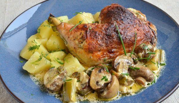Pielea pulpelor este foarte rumenă și crocantp iar când bați în ea cu furculița face tac-tac. E friptură, nu fiertură de pui! La așa o mâncare consistentă nu e nevoie de garnituri grele așa că am ales niște cartofi fierți în coajă (în apă cu sare) peste care am presărat niște mărar verde. Sosul cremos al fripturii are smântână și unt topit cu usturoi așa că va fi foarte fain absorbit de acești cartofi simpli. Puteți înlocui cartofii cu orez, paste simple sau mămăliguță. Ce gust și aromă! Și cât de fragedă este carnea! Vă dați seama că sub piele s-au petrecut niște chestii tare faine: untul aromat cu usturoi s-a topit și a pătruns în carne. Fabulos!