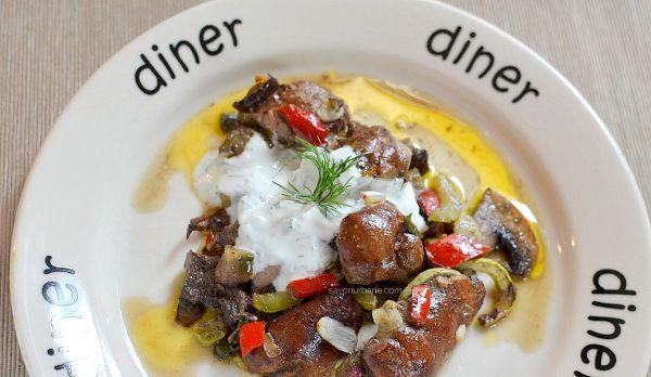 Am făcut repede un sos de iaurt (sau smântână mai slabă) cu usturoi și mărar. Am împărțit ficatul și legumele în farfurii, am pus câte o lingură bună de sos de smântână sau iaurt și am presărat totul cu verdeață. Nu vă puteți imagina cât de gustoasă este combinația! Ficățeii sunt rumeni dar moi și cremoși la mijloc, legumele sunt faine, rumenite și au textură. Să nu vă mai spun cât de fain e saftul (sosul) format în tavă! Numai bun de plimbat pâinea prin el. Ardeiul are arome specifice de ardei copt, ciupercile sunt aurii, vinetele sunt cremoase și gustoase.