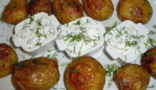 Mod de Preparare: spalam bine de tot cartofii (cu un burete) apoi ii lasam la uscat; intr-o tava incapatoare aruncam asa in gluma cartofii curati, ii stropim cu vreo 2-3 linguri de ulei de masline, presaram niste sare grunjoasa peste si ii dam apoi la cuptor cca 40-50 minute! Intre timp pregatim si sosul de iaurt astfel: tocam ceapa marunt, mararul si le punem intr-un bol incapator turnam peste 1-2 borcanele de iaurt cremos, apoi adaugam si zeama de o lamaie, amestecam totul bine pana la omogenizare, iar la final, potrivim de sare si piper! pentru o aroma si mai intensa putem adauga si 2 catei de usturoi! Sosul astfel obtinut se da la frigider cca jumate de ora, cat timp cartofii sunt la copt- astfel incat sa se imbine aromele! Cartofii fierbinti se servesc cu sos rece de iaurt!