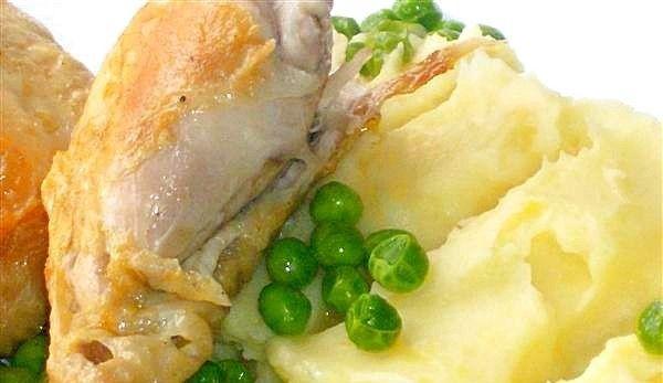 Mod de Preparare: Se spală pulpele şi se pun în tigaia dry cooker cu 2 linguri de ulei şi un pahar de apă. Se pune capacul şi se lasă la foc mic să se fragezească carnea. Pe parcurs întoarcem pulpele pe ambele părţi. Folosesc această tigaie în principal pentru pulpe şi cartofi natur şi asta atunci când prepar pentru copii. Când apa s-a evaporat şi carnea s-a rumenit puţin, punem mazărea lângă pulpe şi mai adăugăm o jumătate de pahar de apă călduţă care să permită fierberea mazărei pentru 5 minute. Tot acum dăm un praf de sare şi unul de piper proaspăt măcinat peste pulpe şi mazăre. Folosesc mazăre congelată şi când se găseşte, în sezon, proaspătă, mazărea la borcan sau cutie, din punctul meu de vedere, pierzându-şi mult din gust şi propietăţi prin prelucrare. Ca o paranteză, o altă combinaţie foarte reuşită şi gustoasă este mazarea cu şnitel de porc. Fierbem cartofii astfel încât apa să acopere permanent cartofii pentru a evita obţinerea unui piure cleios. Îi scoatem imediat din apă sau scurgem apa – oprim o ceaşcă cu apă dacă nu avem lapte – şi pasăm cartofii fierbinţi până nu mai sunt cocoloaşe. Adăugăm 2 linguri de unt, frecăm cu o lingură de lemn şi punem treptat lapte până obţinem consistenţa dorită. Dăm sare după gust şi pentru a obţine un piure mai fin folosim mixerul pentru 2 minute.