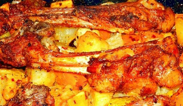 Mod de Preparare: Într-un bol amestecăm o lingură cu boia și câte o linguriță de piper proaspăt măcinat, cimbru uscat și sare mare. Amestecăm aceste condimente și cu acest amestec frecăm bine coastele de miel pe toate părțile. Le lăsăm să stea zece minute. Încingem o tigaie cu puțin ulei și rumenim bine coastele. Curățăm dovleacul de coajă, îl înjumătățim și înlăturăm semințele după care îl tăiem cuburi, bucăți, de 1,5-2 cm, cât o îmbucătură. La fel, curățim și tăiem cartofii. Dovlecelul, tânăr și proaspăt, îl tăiem cuburi fără ai înlătura coaja. Bucățile de dovleac, cartofi și dovlecel le punem într-o tava, asemeni unui pat. Peste ele punem 2-3 linguri de ulei de măsline, presărăm sare, puțin piper, cimbru cât ei între trei degete și o lingură cu fulgi de ardei (fulgii de ardeii îi puteți face și dintr-un ardei uscat, mărunțindu-l cu cuțitul – chiar este mai aromat). Amestecăm ușor cuburile cu o lingură, să se învelească bine în ulei și condimente. Așezăm militărește (adică ordonat) în tavă, coastele de miel rumenite, pe patul din dovleac, cartofi și dovlecel. Dăm tava la cuptor pentru cca 45 de minute, până ce toate-s rumene și îmbujorate. Combinația asta de barabule cu bostan cu coaste fragede de miel merge bine cu murătura ce tocmai s-a împlinit la gust.