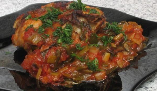 Mod de Preparare: Ceapa si usturoiul se curata si se spala bine. Apoi se taie in bastonase lungi de 4-5 cm. Ficateii de pui se curata, se spala si se pun la fiert in apa colocotita pentru 5 minute. Apoi se scot din apa (eventual se spala). Ceapa si usturoiul se oparesc intr-o oala cu apa clocotita (data jos de pe foc) pentru 5 minute. Intr-un vas pentru cuptor se pun ficateii si deasupra se pun ceapa si usturoiul. Apoi se pun sucul de rosii si pasta de tomate amestecate impreuna si paharul cu vin. Se sareaza si se pipereaza dupa gust. Vasul se da la cuptor pentru 40 de minute. Deasupra de pune marar taiat marunt.