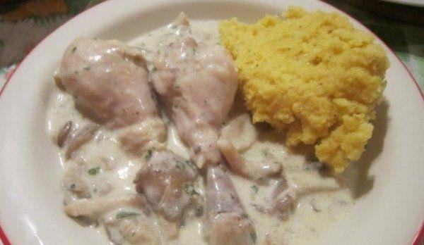 Mod de Preparare: Taiati ceapa, puiul si ciupercile in bucati. Topiti untul intr-o tigaie. Adaugati ceapa si caliti. Adaugati carnea de pui, catel de usturoi, sare si piper si amestecati bine. Acoperiti si lasati 5 minute pe foc mediu. Adaugati ciupercile si gatiti timp de 5 minute, amestecand. Se adauga smantana si se amesteca timp de aproximativ 3 minute. Gata!