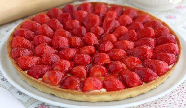 Pentru crema de patiserie: Puneti laptele la fiert impreuna cu batonul de vanilie. Intre timp, puneti galbenusurile de ou intr-un castron si adaugati zaharul. Frecati pana devine galben-palid. Adaugati amidonul de porumb si amestecati bine. Odata ce laptele a fiert, se adauga incet peste amestecul de oua+zahar+ amidonul de porumb. Puneti totul in vas la foc mediu. Se amesteca in mod constant cu o lingura de lemn pana cand ajunge la consistenta dorita. Acest pas dureaza aproximativ 10 minute. Apoi lasati crema sa se raceasca si acopeririti cu folie de plastic pentru a preveni formarea unei pelicule. Dupa ce aluatul si crema s-au racit, se bate crema ca sa se umfle si se adauga peste aluatul copt. Se spala capsunele si se taie coditele. Apoi se taie in jumatate pe lungime si se aranjeaza frumos peste crema. Puneti jeleul de capsune pentru 30 secunde in cuptorul cu microunde, apoi se strecoara pentru a se elimina semintele. Adaugati usor jeleul strecurat peste capsune, apoi dati la rece pentru o cel jumatate de ora, inainte de servire. Gata, tarta dvs. cu capsune este gata de mancat!