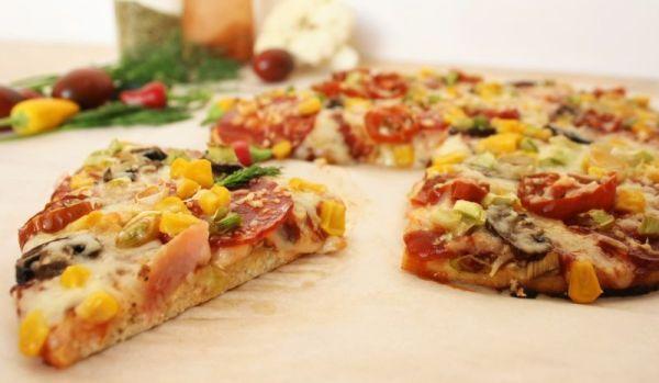 Mod de Preparare: Spălați conopida, rupeți buchetele mici și mărunțiți la robotul de bucătărie, puneți conopida mărunțită la cuptor pentru 15 minute, apoi scoateți, lăsați să se răcească puțin și scurgeti foarte bine de suc: folosiți un tifon sau un material curat, care absoarbe umezeala. Bateți ouăle bine cu puțină sare, adăugați-le peste conopida scursă împreună cu mozzarella și modelați "aluatul" pe tavă. Coaceți blatul de conopidă aproximativ 12-15 minute la foc iute. Acum adaugati pe blatul precopt pasta de tomate sau ketchup-ul, peste care presarati oregano; Dati mozzarella pe razatoare si adaugati peste pizza cea mai mare parte, lasand pentru sfarsit o lingura de mozzarella rasa. Acum puteti adauga restul toppingurilor: salamul, muschiul, ciupercile, prazul, porumbul, iar la sfarsit rosiile cherry feliate. Acum mai adaugati lingura mozzarella peste toata pizza si dati la cuptor la foc mediu pentru aproximativ 12- 15 minute.