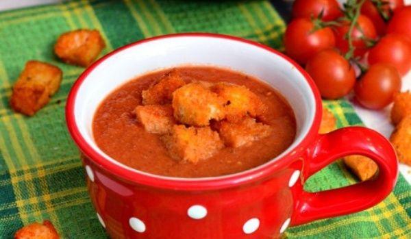 Se toarna in blender si se mixeaza totul intr-o crema. Se poate folosi bineinteles si un mixer special, direct in oala. A pasat-o si prin sita, in acest fel devine foarte catifelata, iar orice urma de seminte de la rosii sunt indepartate. Se incalzeste supa pe foc din nou, se adauga smantana si mult busuioc proaspat tocat. Se potriveste de sare si/sau zahar daca mai este nevoie. A mai adaugat putin zahar la sfarsit, deoarece rosiile mele nu au fost prea dulci, iar supa era un picut prea acra. Se poate servi intr-un castron micut, ca si aperitiv, sau intr-o ditamai farfurie adanca ca si fel principal. Merge de minune cu paine prajita, ciabatta sau bagheta. Ma gandesc ca si niste crutoane ar merge de minune.