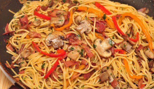 Se caleste ceapa in ulei, se adauga ciupercile taiate marunt, delicatul de legume si se adauga pasta de tomate. Se lasa 5 minute si se pun spaghetele in sosul format. Se mai lasa putin si se adauga mararul tocat marunt. Se adauga sare dupa gust.