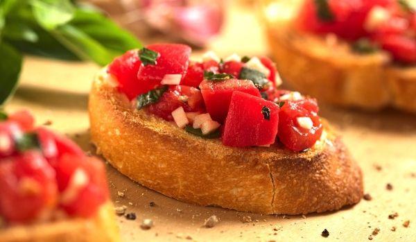 Mod de Preparare: Tocăm roșiile cubulețe, iar ceapa si usturoiul vor fi tăiate mai fin. Punem la un loc toate ingredientele și le asezonăm cu uleiul de măsline, sarea și piperul. Feliem bagheta pe diagonală pentru a ne ieși felii mai lungi. Le ungem cu puțin ulei de măsline sau le lăsam 4-5 minute la cuptor pentru a se rumeni. Așezăm compoziția pe feliile de păine proaspăt unse sau prăjite și servim brushetele.