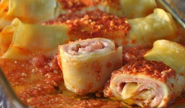 Se scot foile cu spumiera, una cate una, se lasa la scurs sau se sterg cu un prosop de hartie si se aseaza una langa alta pe o folie sau o suprafata plata; se aseaza feliile de salam la capatul foii de lasagne. Se lasa sa se scurga branza, se taie felii subtiri si se repartizeaza uniform peste feliile de salam. Se ruleaza foile de lasagne. Se unge o forma plata, termorezistenta, si se aseaza rulourile de paste. Se pregateste sosul de rosii. Se toarna deasupra ruladelor de paste. Se coace 12-15 minute.