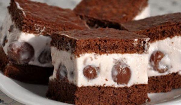 Mod de Preparare: Incingeti cuptorul la 200 grade C. Separati ouale; amestecati galbenusurile cu zaharul. Bateti spuma albusurile cu un praf de sare, apoi adaugati-le galbenusurilor. Adaugati faina, amidon, cacao, toate in prealabil cernute. Amestecati totul cu o spatula. Turnati compozitia intr-o tava intinsa, unsa si pudrata cu faina sau tapetata cu hartie de copt. Coaceti 10-12 minute; rasturnati apoi blatul pe un prosop de bucatarie pudrat cu zahar sau pe o hartie de copt. Indepartati cu grija hartia de pe blat si taiati-l pe jumatate. Desfaceti borcanul cu cirese. Asezati o jumatate de blat intr-o forma tapetata cu folie transparenta. Insiropati blatul cu siropul preferat. Inmuiati foile de gelatina in apa rece. Scurgeti borcanul cu compot si incalziti sucul. Topiti gelatina in suc. Lasati sa se raceasca. Adaugati ciresele. Amestecati iaurtul cu zaharul; turnati deasupra compozitia cu cirese si amestecati usor. Bateti frisca si incorporati-o amestecului rezultat. Lasati la frigider pentru cca. 30 de minute.
