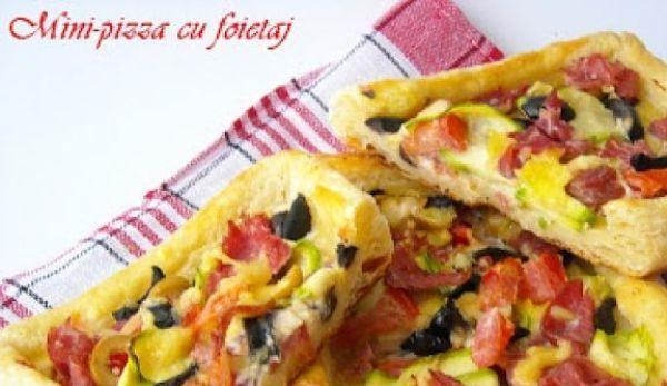 Mod de Preparare: Se intainde aluatul si se imparte in 2 dreptungiuri, avand grija sa taiem si fasii late de 1 cm, cu care inconjuram marginile dreptungiurilor. La cuptor se vor inalta si va fii ca o bordura pentru ingredientele din centru. Pe tava pentru cuptor se pune foaie de copt si se aseaza bucatile de foietaj. Se ung in centru cu mutar sau pasta de rosii, se presara cascaval ras. Se adauga fasii de dovlecel taiat cu razalitorul de cartofii. Deasupra se aseaza bucati de prosciutto, masline fara samburi tocate mare si felioare de rosie fara suc si samburi. Se condimenteaza, se presara cascaval ras, cimbru si rozmarin, uscat sau proaspat, de care aveti. Se stropesc cu ulei de masline, oet balsamic (optional), iar pe margini se dau cu ou batut, intins cu o pensula. Se coace cam 25 de minute in cuptorul incins deja.