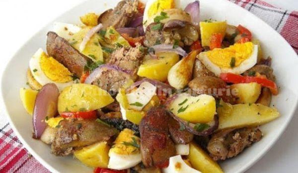 Mod de Preparare: Se fierb cartofii in coaja, apoi se scurg, se curata i se taie in sferturi. Ciupercile se taie jilien si se soteaza intr-o tigaie mare larg (wok), in unt si ulei de masline. Se adauga si ficatul pentru 4-5 minute, la foc moderat. Se scot apoi din tigaie si se pun pe un vas cald si se pastrezeaza acoperite. Se strecoara uleiul din tigaie ca sa ramana curat. Se adaug ceapa i se soteaza, apoi se adauga si usturoiul. Separat se fierb 3-4 oua tari, care se taie apoi in sferturi. Pe o farfurie calda se amesteca toate ingredientele impreuna si se stropesc cu sosul ramas in care se mai adauga un strop de sos balsamic.