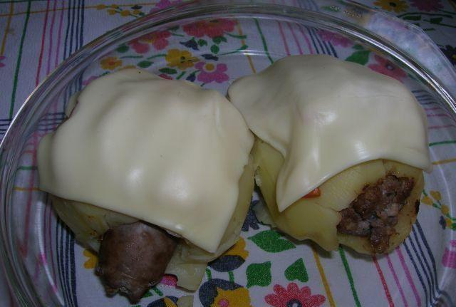 Preparare: Se curata cartofii de coaja, se gauresc si se face un tunel prin ei cit sa intre cirnatul. Se pun cartofii la fiert in apa sau la abur pe cosuletul special pt abur, timp de 10 minute; se fierbe si morcovul odata cu ei. in timp ce cartofii fierb se prajesc cirnatii in tigaie: intepati se pun in tigaia cu 1 deget de apa, cind scade apa se pune putin ulei si se prajesc in sosul lor pina se rumenesc. Se scot cartofii si se introduce cirnatul, apoi se pun niste feliute de morcov pe cartofi si cite o feliuta de brinza; se introduce si la cuptor cit sa se topeasca brinza si se serveste cu salata.
