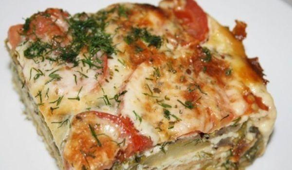 Mod de Preparare: Se curata dovleceii si vinetele de coaja, si se coc putin pe gratar sau pe o tigaie de teflon. Se unge un vas de yena sau de ceramica cu unt (ulei) si se tapeteaza cu pesmet pentru a nu se lipi. Se aseaza un strat de vinete pe fundul vasului, presaram branza rasa, ou batut si marar,