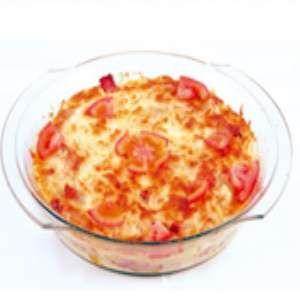Se pune compozitia intr-un vas, se adauga pieptul de pui tocat marunt si se introduce la cuptor la o temperatura de 190°C timp de 15 minute.