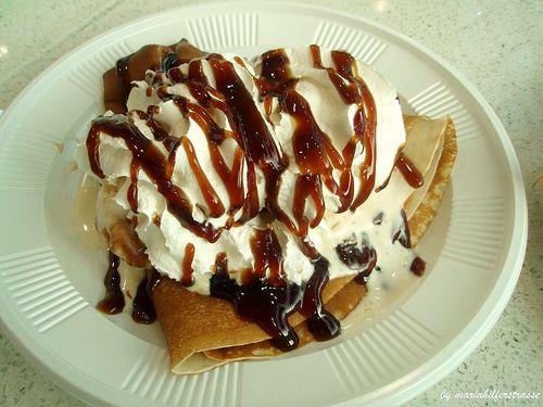 Mod de preparare: Cand sunt gata clatitele, se scoate inghetata din frigider, se pune 1 lingura mare de inghetata in mijlocul fiecarei clatite fierbinti; Se impacheteaza clatitele in forma patrata si se orneaza cu frisca deasupra.