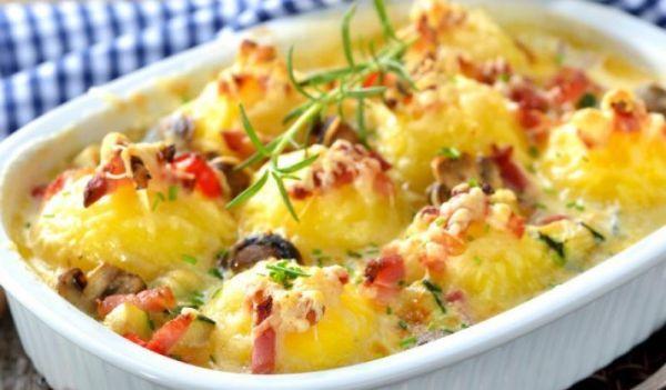 Mod de preparare: Întâi de toate, încălzește cuptorul la 200 grade Celsius și unge o tavă cu unt. Pune cartofii la fiert în apă fierbinte, cu sare, tăiați rondele sau cubuleți, în funcție de cum îți plac să-i servești. Se fierb timp de 10-15 minute, în funcție de grosime. Atenție! NU trebuie să îi lași să se facă până la capăt. În continuare, amestecă smântana cu oul și parmezanul și presară puțină sare și puțin piper. Taie ceapa și pune-o la prăjit în unt. După ce devine ușor aurie, sticloasă, adăugă curcanul tăiat cubulețe. Se lasă puțin la călit, până începe să se simte aroma cărnii de curcan. Separat, poți pune prăjit (ușor) câteva bucăți de bacon sau costiță, tăiate mărunt. La final, scurge cartofii de apă și taie-i dacă nu i-ai tăiat înainte de a-i pune la fiert. Pune cartofii în tavă, adaugă sosul cu smântână pe deasupra și presară bucățile de carne pe deasupra. Se dă la cuptor până se rumenește ușor – aprox. 30 de minute. După 15 minute, se reduce la jumătate focul și se verifică dacă cartofii s-au pătruns.