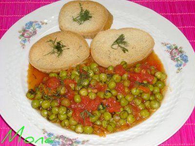 Ingrediente: 1 kg mazare, 2 cepe mari (200g), 3 linguri de ulei, o conserva de 400 g rosii in bulion, 1 legatura marar, sare, piper, 12 felii paine (franzela), lapte, 3 oua, ulei pentru prajit.