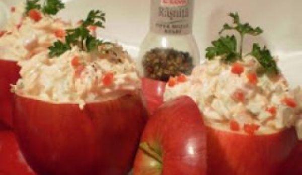 Mod de Preparare: Telina si morcovul se curata si se rade prin razatoare. Castravtele gogosarul si pastrama se taie in cubulete mici. Merele se scobesc lasand peretii cat mai subtiri. Miezul rezultat se taie si el cat mai marunt. Intr-un castronel amestecam pastrama si legumele rase si cele taiate marunt. Se adauga smantana si se potriveste de gust cu sare si piper mozaic. Se amesteca pana obtinem o pasta omogena. Se umplu merele si se decoreaza dupa imaginatia fiecaruia.