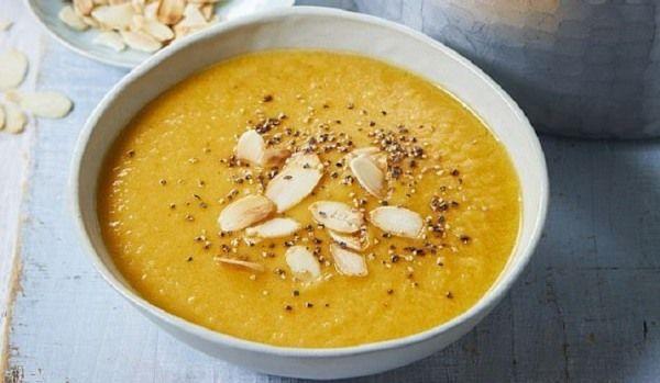 Mod de preparare: Preîncălziți cuptorul la 200 de grade. Puneți legumele stropite cu ulei pe o tavă mare de copt și dați-le la cuptor pentru aproximativ 35 de minute. Întoarceți legumele după 15 minute sau după ce se înmoaie puțin. Lăsați-le până se rumenesc puțin, dar să nu devină crocante. Transferați legumele într-o cratiță mare și adăugați apa. Pasați legumele cu un mixer vertical până obțineți o cremă. Adăugați încă 600 ml de apă rece și dați cratița la foc mic, amestecând continuu. Condimentați după gust cu sare și piper. Serviți-o cu fulgi de migdale deasupra.