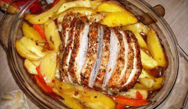 Mod de Preparare: Pentru crusta de condimente am pisat in mojar niste sare de mare, un trio de piper rosu, negru si verde si fulgi de ardei iute, la care am adaugat un amestec gata pisat din usturoi si ardei iute. Am invelit bine bucata de cotlet dezosat in acest amestec si am bagat tava, acoperita cu folie de aluminiu, la cuptor, la foc mediu spre mic, pentru 35 de minute. Dupa cele 35 de minute am scos carnea si am crestat-o in felii, ca sa se patrunda bine la mijloc. Am mai dat la cuptor pentru 15 minute.