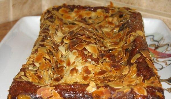 Presara deasupra checului fulgii de migdale apoi da checul la copt 55 minute pana cand la inserarea unei scobitori in centru aceasta va iesi curata. Dupa ce s-a copt, scoate checul din cuptor, unge-l cu 2 linguri miere si presara-l cu un praf de sare apoi da-l la copt inca 5 minute. Dupa cele 5 minute, scoate checul din cuptor, stropeste-l cu 2 linguri miere ramasa si lasa-l sa se raceasca apoi serveste-l.