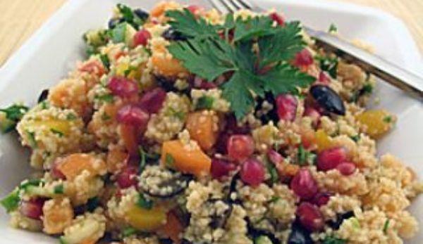 Mod de Preparare: Se toarna sucul de portocala peste cuscus, intr-un castron. Se lasa cuscusul la inmuiat, circa 15-20 de minute. Se amesteca apoi cuscusul rehidratat cu ardei grasi, morcov, ceapa verde, masline si castravete. Se sareaza si se pipereaza. Se presara cu seminte de rodie si patrunjel tocat si se serveste.