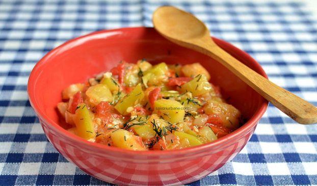 Mod de Preparare: Dovleceii se spala si se taie cubulete mici. Dovleceii se tavalesc prin faina si se prajesc pe rand in ulei incins. Se scot si se pastreaza la cald. Uleiul ramas se strecoara, sa inlaturam rezidurile de la faina si calim ceapa tocata marunt. Cand ceapa incepe sa se ingalbeneasca, adaugam rosiile tocate marunt, usturoiul tocat si dovleceii. Acoperim cu apa cat sa acopere dovleceii si lasam sa fiarba acoperit pentru 10-15 minute. Condimentam cu sare si piper. Mararul se adauga in momentul cand stingem focul. Se serveste ornata cu rosii si marar verde.