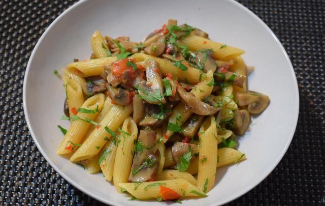Mod de Preparare: Spalam ciupercile si le taiem fasii nu prea subtiri. Le sotam intr-o lingura de ulei, adaugam putina sare si le lasam sa fiarba acoperite pana scade apa. Socatem ciupercile din tigaie, punem 1 - 2 linguri de ulei si calim ceapa tocata marunt. Cand ceapa este translucida, adaugam rosiile decojite si tocate cubulete, ardeiul iute tocat marunt, usturoiul si telina tocata fin. Lasam la foc mic pana sosul se ingroasa si toate ingredientele sunt fierte, aproximativ 15 - 20 minute. Adaugam cimbrul, potrivim de sare si amestecam sosul cu pastele fierte si scurse. Aranjam pe farfurii pastele, adaugam ciupercile si deasupra presaram patrunjel proaspat tocat. Un pranz light de post daca nu folositi paste cu ou, cu proteine din ciuperci si doar 110 calorii la 100 de grame.