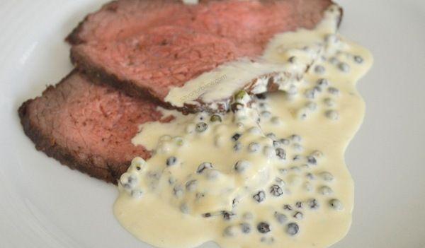 Se prajesc bucatile de carne intr-o tiagaie de teflon in care s-a incalzit in prealabil uleiul de floare- la foc tare. Se prajeste ficare bucata pe o parte, la foc tare, cel putin 4 minute fara a se intoarce, apoi se intoarce pe cealalta parte si se mai prajeste la foc mediu in functie de cat o doriti de rosie inauntru, inca 5, 6 minute. Daca folositi un termometru de carne pentru ” in sange” friptura sa nu depaseasca in interior 50 grade C(120 grade F) iar pentru “mediu in sange” sa nu depaseasca 55 de grade C (130 grade F). Se ia de pe foc si se acopera cu folie de aluminiu. Se presara o portie generoasa de piper zdrobit pe fiecare parte a carnii. Se pastreaza la cald pana pregatim sosul de piper. Sosul e foarte simplu. Intr-o tigaie se pune ceapa taiata si se amesteca (2 minute). Apoi se adauga cognacul si se mai fierbe 3 minute. Apoi adaugam supa de vita fierbem 4-5 minute, pana sosul scade. Apoi adaugam frisca neindulcita, mai fierbem 3 minute. La sfarsit luam de pe aragaz sosul si adaugam sare, patrunjel si piperul ramas.