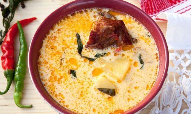 Mod de prepare: Se taie ceafa în îmbucături mici, ceapa, zarzavatul şi roşiile în cubuleţe. Se pun toate la fiert în 3 l apă rece cu boia, piper şi oţet. Se taie cartofii curăţaţi în îmbucături mici. Se toacă tarhonul şi leuşteanul. După 30 minute de fiert se adaugă şi cartofii. Se bate smântâna cu ou, zahăr, bulion de roşii şi cu un pic de zeamă de ciorbă. După încă 20 minute de fiert se drege ciorba, se adaugă verdeaţă, se lasă să dea în câteva clocote.