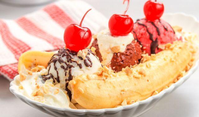 Mod de Preparare: Banana se taie în jumătate apoi pe lungime și se prăjește puțin în unt. Bucățile de banană se așează în farfurii pentru desert, se pun cele 4 cupe de înghețată pe jumătățile de banană și se toarnă deasupra sosul de ciocolată. Se pune frișca și se presară fulgi de migdale.