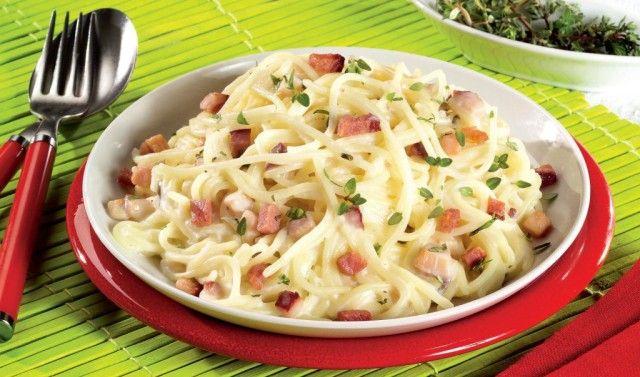 Mod de preparare: Se pun la fiert spaghetele în apă cu un praf de sare. Între timp, ceapa şi baconul se taie în cubuleţe fine, iar cimbrul se spală şi se curăţă. Într-o tigaie încinsă, se rumeneşte uşor baconul în puţin ulei, apoi se adaugă ceapa tocată mărunt şi se lasă puţin la prăjit. Se mai adaugă smântâna şi frunzele de cimbru şi se mai lasă câteva minute pe foc, amestecând încontinuu. Spaghetele fierte se trec rapid printr-un jet de apă rece şi se lasă la scurs. Se răstoarnă peste sos împreună cu ouăle crude şi parmezanul. Se amestecă din când în când, să nu se prindă de vas.