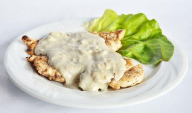 Pentru sos pregatim o cratita in care punem untul sa se topeasca, adaugam branza gorgonzola taiata si lasam la foc mic pana cand branza se topeste. Adaugam smantana, condimentam cu sare si piper apoi lasam sa fiarba apriximativ 5 minute, amestecand continuu. Asezăm bucatile de pui pe farfurie, iar deasupra punem sosul de branza. Servim cu garnitura de orez sau piure de cartofi.