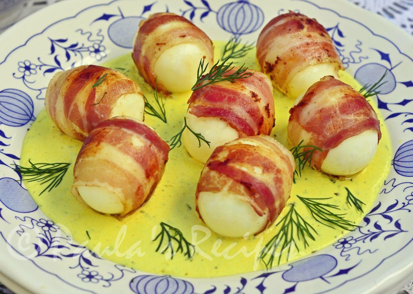 Mod de Preparare: Se curata cartofii, se taie si se fierb in apa cu sare aproximativ 25 min. Ouale se fierb tari apoi se decojesc, prazul se taie rondele si se caleste 5-7 min. intr-o 1 lingura de unt. In alta cratita se topeste 1 lingura de unt in care se caleste faina se pune treptat supa si se lasa sa fiarba 5 min. Apoi se inglobeaza smantana, mustarul, sarea si piperul. Fiecare ou se infasoara intr-o felie de bacon, se incinge uleiul intr-o tigaie si se prajesc inauntru ouale.Se scot ouale prajite din tigaie si se aseaza pe un platou adanc, impreuna cu sosul si cu prazul. Se scurg cartofii, se lasa sa se racoreasca putin si se presara deasupra patrunjel. Se servesc alaturi de oua, in sosul de mustar.